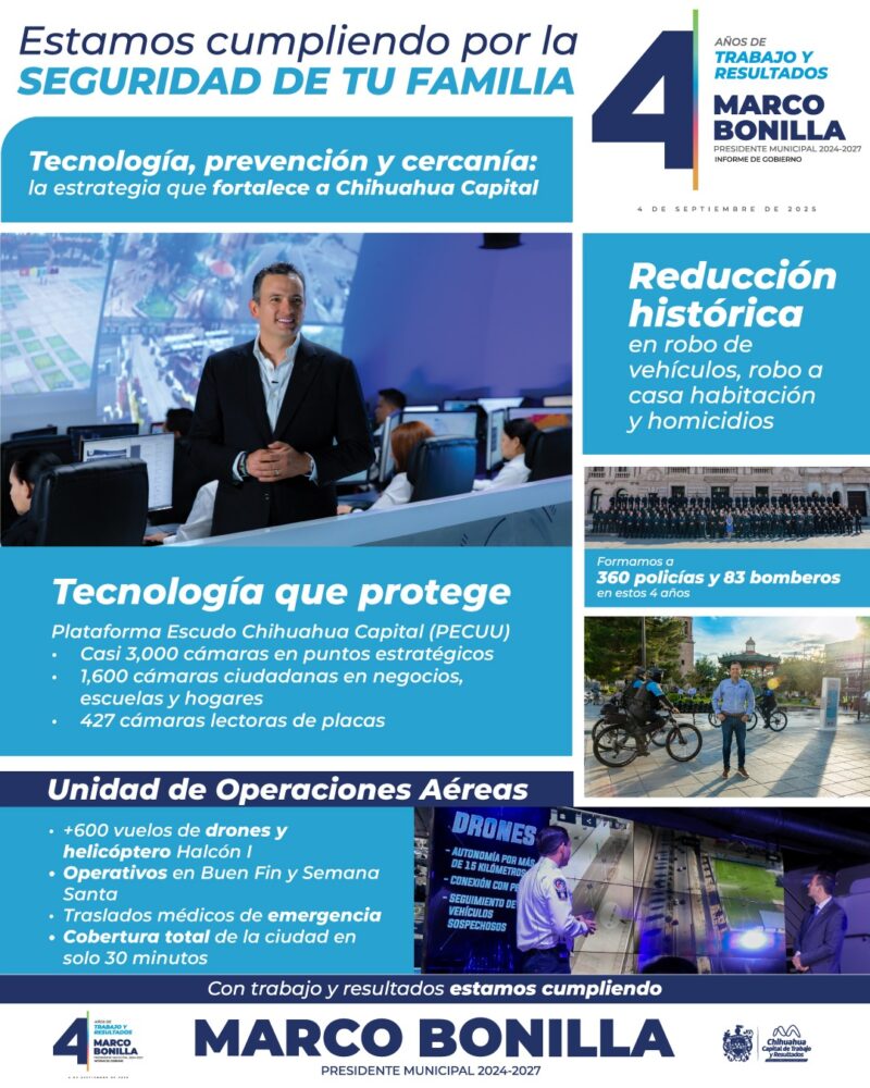 Con estas acciones, el Gobierno Municipal reafirma que, en Chihuahua Capital, con trabajo y resultados estamos cumpliendo, al consolidar una estrategia de seguridad que protege la vida, el patrimonio y la tranquilidad de las familias.