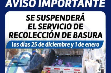 No habrá servicio de recolección de basura el 25 de diciembre y 1 de enero