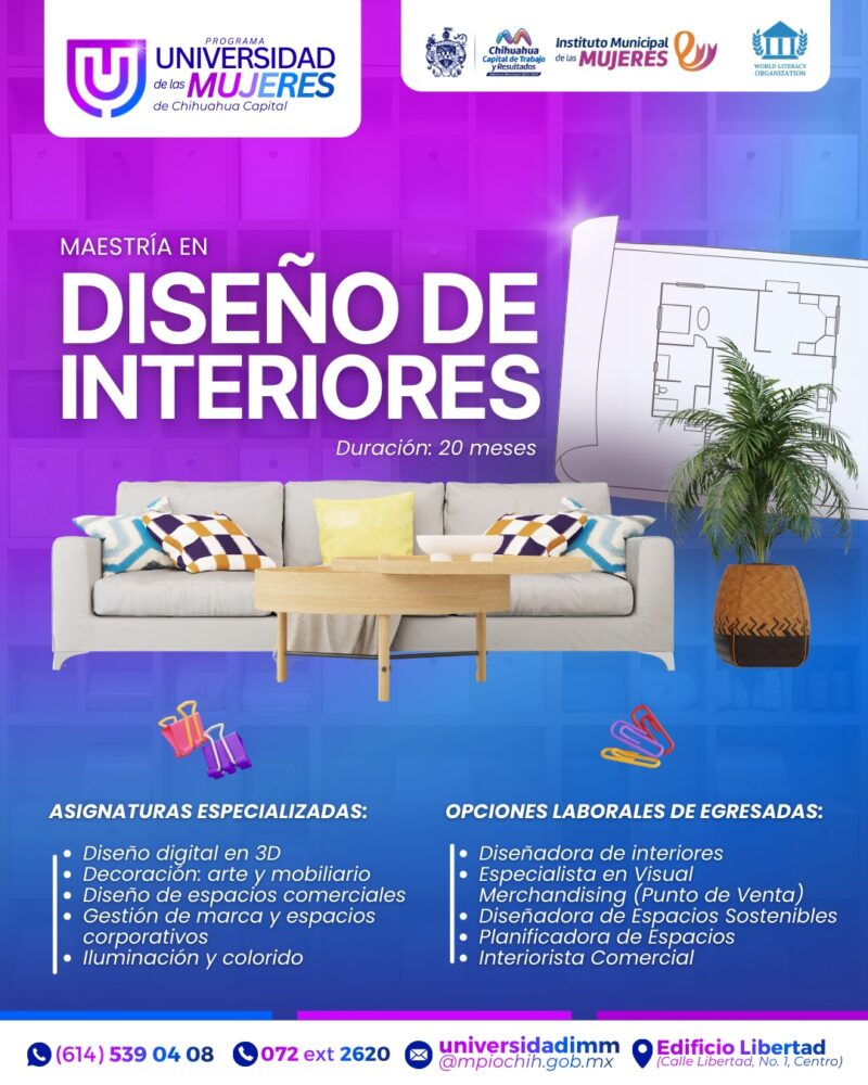 H. Ciudad de Chihuahua, Chih., a 17 de Febrero de 2026.– El Gobierno Municipal de Chihuahua, a través del Instituto Municipal de las Mujeres (IMM), invita a las mujeres del estado a fortalecer su talento creativo y profesional al cursar la Maestría en Diseño de Interiores en la Universidad de las Mujeres, con becas que van del 65 al 80 por ciento.