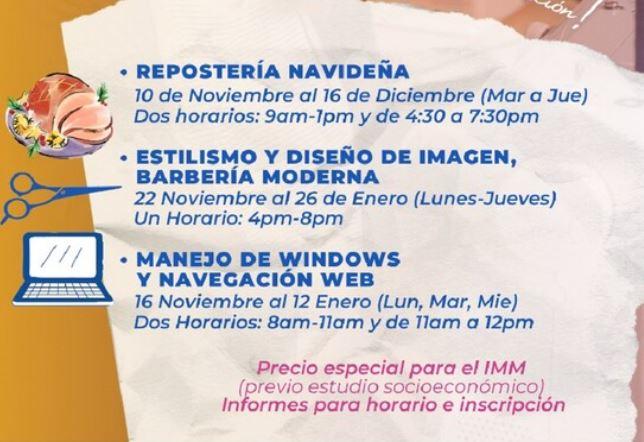 Los cursos son impartidos por el CECATI con precio especial para el IMM de 213 pesos. Para solicitar más información y apartar tu lugar comunícate al teléfono 072 extensiones 2611 y 2613 o bien, acude a las instalaciones del Instituto en calle 4a. #2411 Col. centro. En horario de 8:00 a 15:30 horas.