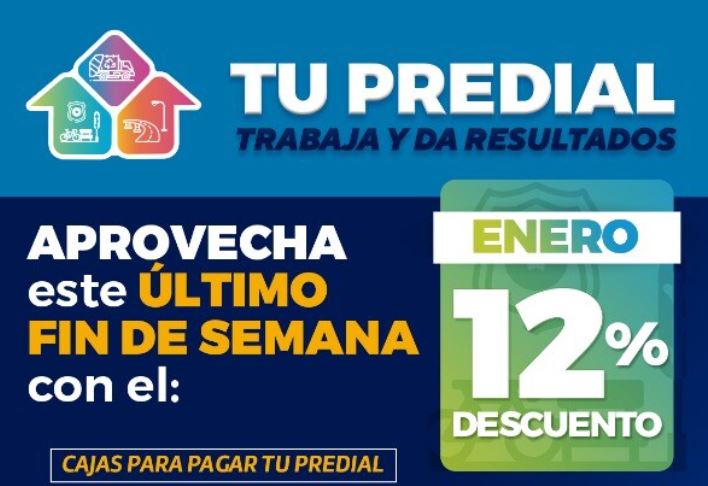 El Gobierno Municipal invita a aprovechar el descuento del 12 por ciento en el Impuesto Predial, el cual estará vigente hasta el 31 de enero; asimismo, este fin de semana, sábado 29 y domingo 30, estarán abiertas las cajas de la Tesorería para quién desee acudir a pagar en físico.