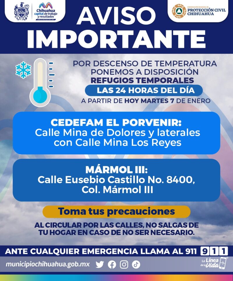Se exhorta a las y los chihuahuenses a tomar precauciones ante los descensos de temperatura y a comunicarse al 9-1-1 en caso de cualquier emergencia. Con estas acciones, el Gobierno Municipal refrenda su compromiso de velar y trabajar por la protección de las familias de Chihuahua Capital durante el invierno.