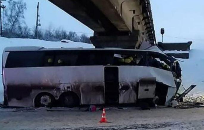 Un autobús de pasajeros se estrelló contra un pilar bajo un puente ferroviario en la localidad de Riazán; al parecer el conductor se quedó dormido.