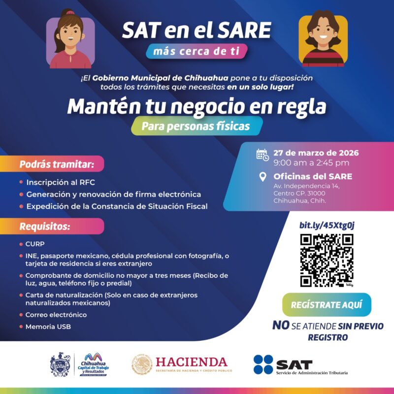 H. Ciudad de Chihuahua, Chih., a 10 de marzo de 2026.- El Gobierno Municipal de Chihuahua, a través de la Dirección de Desarrollo Económico y Competitividad y en coordinación con el Servicio de Administración Tributaria (SAT), realizará una nueva jornada del programa “SAT en el SARE”, iniciativa que desde 2021 ha beneficiado a 673 personas al acercar trámites fiscales de forma ágil y accesible.