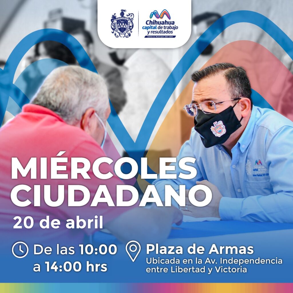 Con la finalidad de conocer las necesidades de las y los chihuahuenses, así como escuchar y atender las peticiones de la ciudadanía, el Gobierno Municipal, a través de la Dirección de Desarrollo Humano y Educación, invita a la ciudadanía a participar en el “Miércoles Ciudadano”, el 20 de abril de 10:00 a 14:00 horas.