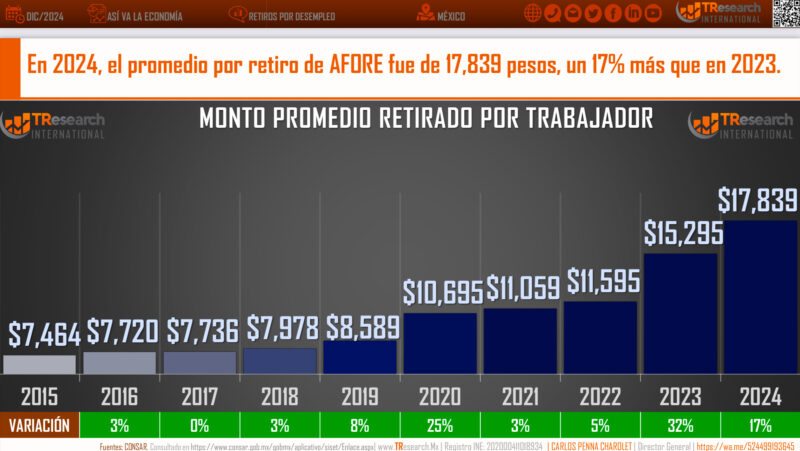 El promedio retirado por trabajador en 2024 fue de $17,839, lo que representó un aumento del 17% en comparación con 2023. Esta cifra subraya el impacto que tiene la incertidumbre económica sobre los fondos de pensión de los trabajadores.