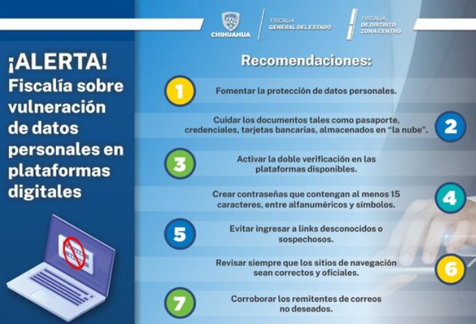 En caso de ser víctima de algún delito electrónico, reportarlo en la página www.pasaeldato.gob.mx o presentar la denuncia en la Fiscalía de Distrito Zona Centro, en la Avenida Teófilo Borunda y Calle 25. Col Santo Niño, ciudad de Chihuahua.