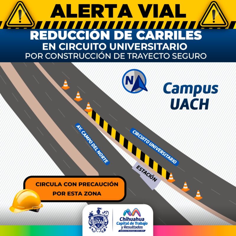 H. Ciudad de Chihuahua, Chih., a 14 de septiembre del 2025.- El Gobierno Municipal, a través de la Dirección de Obras Públicas, alerta por la reducción de carriles en el Circuito Universitario a la altura de la avenida Campo del Norte en el sentido norte-sur debido a los trabajos de construcción del trayecto seguro, proyecto ganador del Presupuesto Participativo.