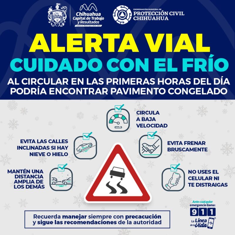 H. Ciudad de Chihuahua, Chih., a 11 de enero de 2026.- El Gobierno Municipal de Chihuahua a través de la Coordinación Municipal de Protección Civil, informa que para el día lunes por la mañana existe la probabilidad de precipitaciones de nieve o aguanieve, por lo que exhorta a la ciudadanía a conducir con precaución ante un congelamiento del pavimento.