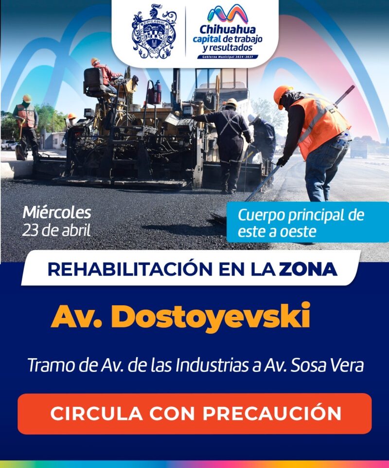 H. Ciudad de Chihuahua, Chih., a 22 de abril del 2025.- El Gobierno Municipal, a través de la Dirección de Obras Públicas, emite una alerta vial por inicio de los trabajos de recarpeteo en la avenida Dostoyevski del tramo entre las avenidas de las Industrias a la Sosa Vera, en el cuerpo principal de este a oeste.