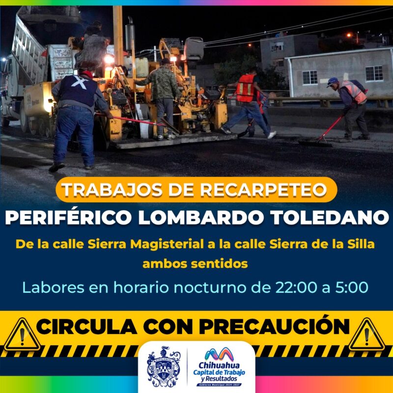 H. Ciudad de Chihuahua, Chih., a 31 de agosto del 2025.- El Gobierno Municipal, a través de la Dirección de Obras Públicas, emite una alerta vial por los próximos trabajos de recarpeteo en el tramo del periférico Lombardo Toledano que abarca de la calle Sierra Magisterial a la calle Sierra de la Silla en ambos sentidos por lo que se exhorta a la ciudadanía a circular con precaución por la zona.