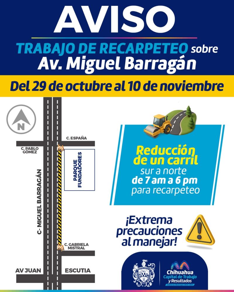 H. Ciudad de Chihuahua, Chih., a 28 de octubre del 2025.- El Gobierno Municipal, a través del Consejo de Urbanización Municipal (CUM), emite una alerta vial por los próximos trabajos de recarpeteo en el tramo de la avenida Miguel Barragán que abarca de la calle Gabriela Mistral hasta la calle España, de Sur a Norte, por lo que se exhorta a la ciudadanía a circular con precaución por el sector.