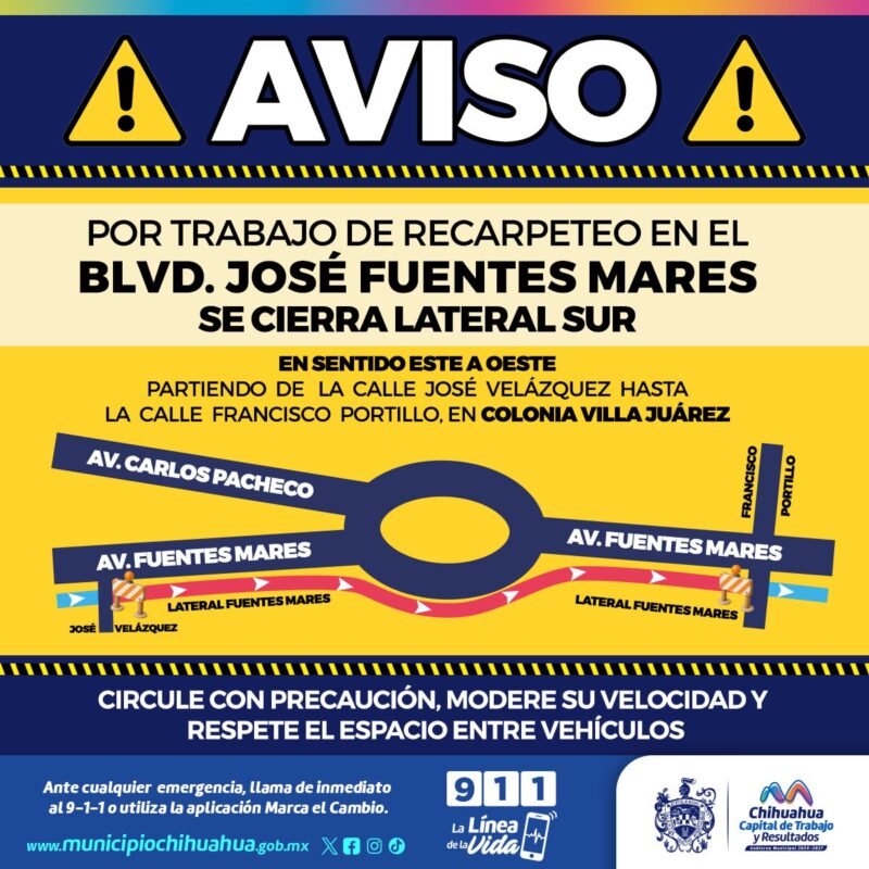 H. Ciudad de Chihuahua, Chih., a 22 de octubre del 2025.- El Gobierno Municipal, a través del Consejo de Urbanización Municipal (CUM), emite una alerta vial por los próximos trabajos de recarpeteo en el tramo de el boulevard José Fuentes Mares que abarca de la calle José Velázquez hasta la calle Francisco Portillo por lo que se exhorta a la ciudadanía a circular con precaución por la zona.