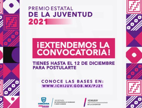El Instituto Chihuahuense de la Juventud (Ichijuv) dio a conocer que amplió al 12 de diciembre, el plazo de la convocatoria para participar en el Premio Estatal de la Juventud 2021, con el objetivo de dar oportunidad a más personas de que muestren sus proyectos o carreras sobresalientes.