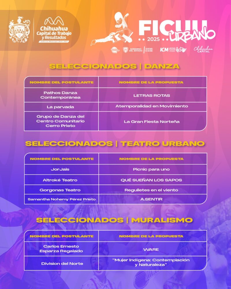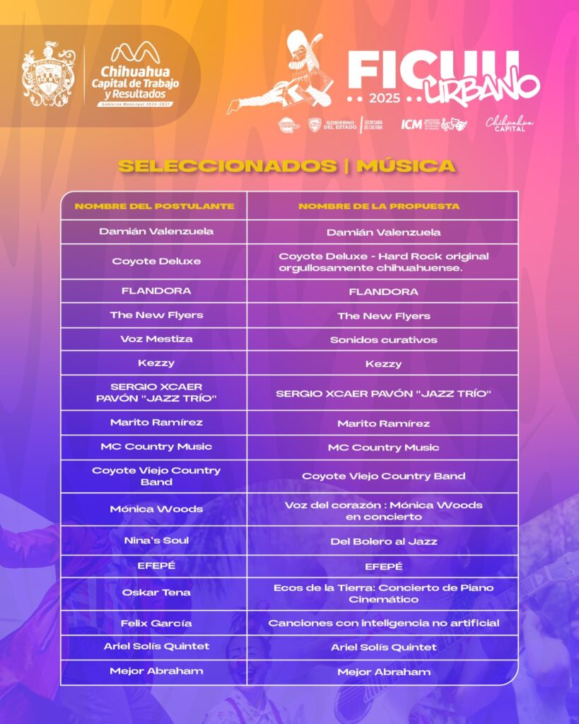 H. Ciudad de Chihuahua, Chih., a 25 de septiembre de 2025.- El Gobierno Municipal de Chihuahua, a través del Instituto de Cultura, dio a conocer a los artistas locales seleccionados que formarán parte del Festival Internacional de la Ciudad de Chihuahua (FICUU) 2025, en su edición FICUU Urbano, que se llevará a cabo este 4 y 5 de octubre en el Centro Histórico de la ciudad.