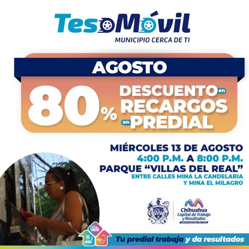 H. Ciudad de Chihuahua, Chih. A 12 de agosto de 2025.- El Gobierno Municipal, a través de la Tesorería, informa a la ciudadanía que sigue vigente el descuento del 80 por ciento en los recargos del Predial, el cual estará hasta el 31 de agosto para personas físicas y morales.