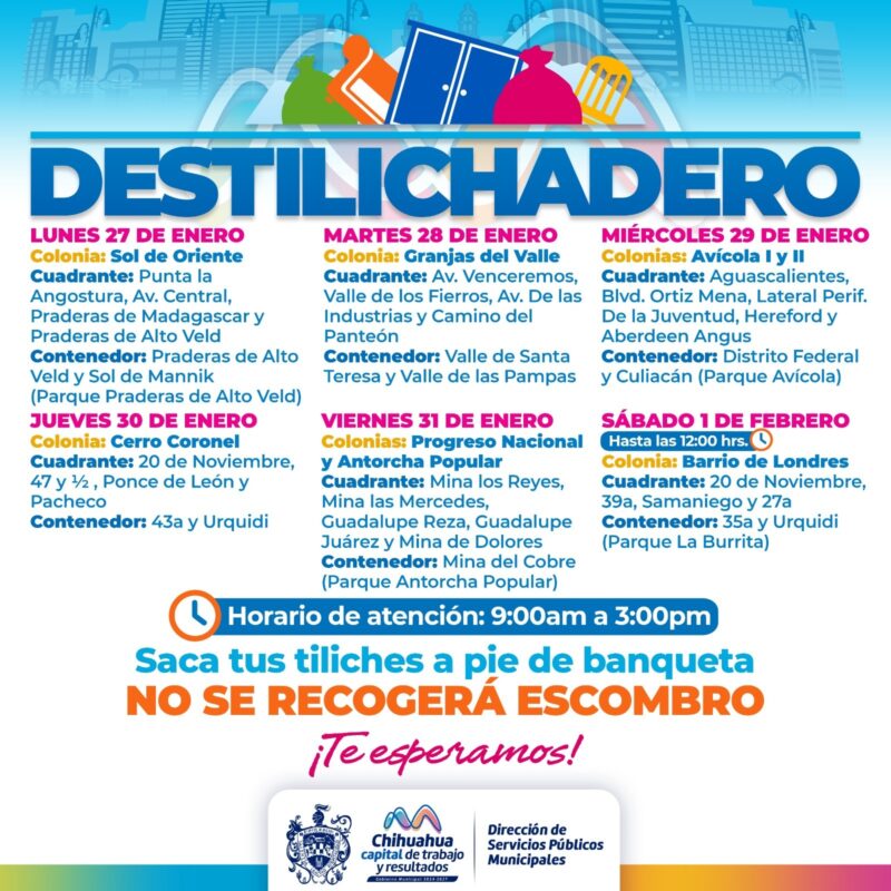 Chihuahua, Chih. A 25 de enero de 2025.- Para evitar acumulaciones de basura de grandes dimensiones en las viviendas, que podría generar plagas o problemas de salud, el Gobierno Municipal, a través de la Dirección de Servicios Públicos Municipales, informa el calendario del programa Destilichadero, que se realizará del 27 de enero al 1 de febrero en ocho colonias de la Capital.