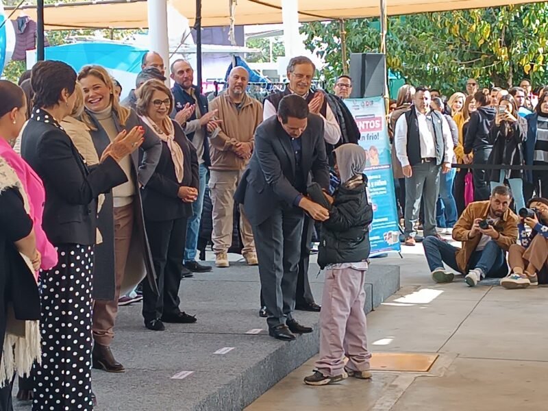 En cabeza Maru Campos, gobernadora del estado de Chihuahua la campaña juntos sin frío 2023 en donde se busca otorgar a los niños más necesitados abrigos para está temporada de invierno.