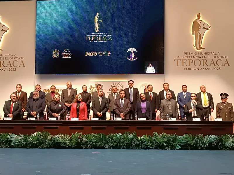Chihuahua, Chih.- Con la presencia del alcalde Marco Bonilla, así como también el secretario del Ayuntamiento, Roberto Fuentes y autoridades municipales encabezaron la entrega al premio Teporaca 2024 donde por primera vez se premian 40 galardonados de bronce