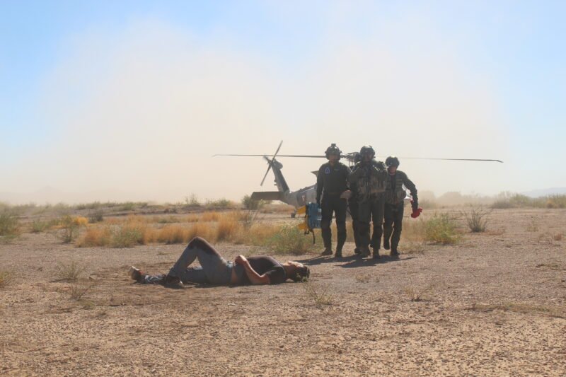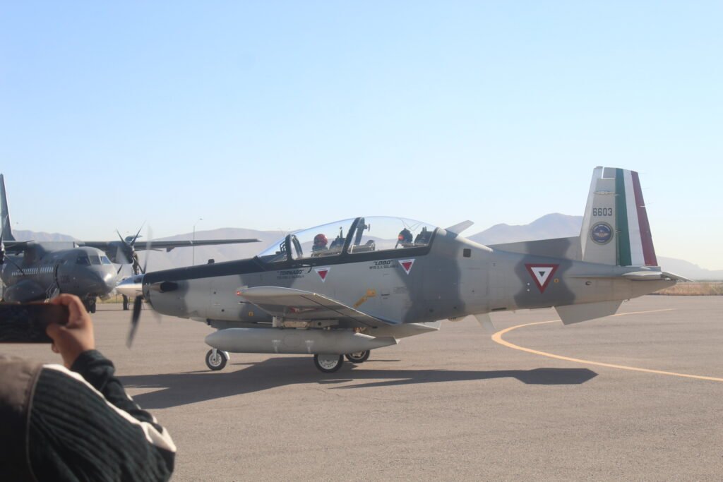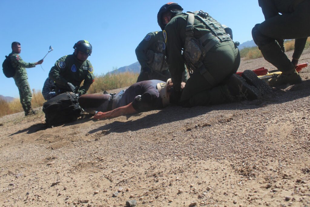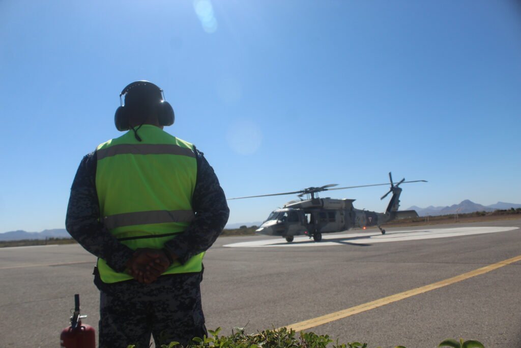 Elementos de la Fuerza Aérea Mexicana realizaron un ejercicio de salvamento, por lo que fue posible notar el helicóptero Black Eagle de rescate de un piloto de los Estados Unidos en un accidente aéreo.