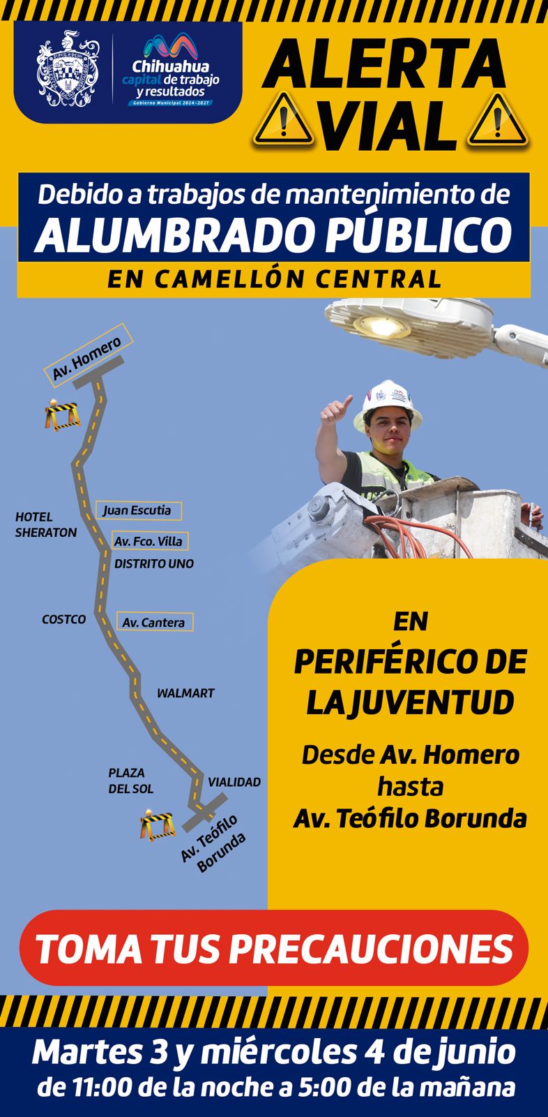 H. Ciudad de Chihuahua, Chih. A 31 de mayo de 2025.- El Gobierno Municipal, a través de la Dirección de Mantenimiento Urbano, anuncia que estará realizando mantenimiento al alumbrado público del Periférico de la Juventud, esto los martes 3 y miércoles 4 de junio, en un horario de 11:00 de la noche a 5:00 de la mañana.