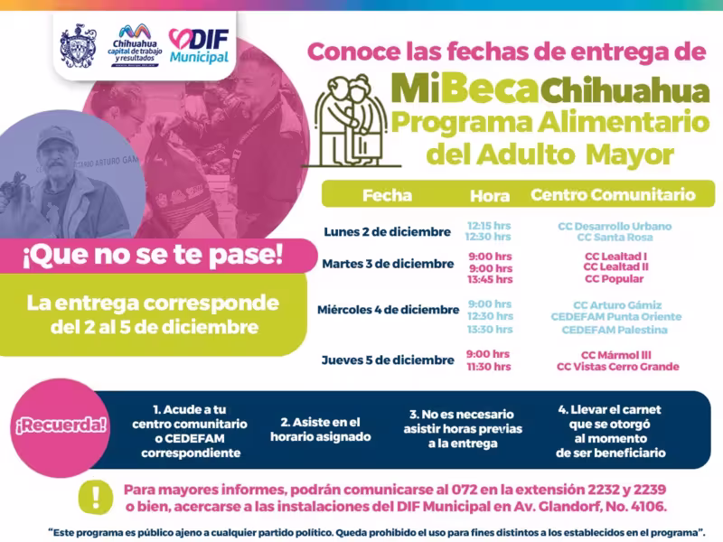 Chihuahua, Chih. A 1 de diciembre de 2024.- En atención al compromiso que el Gobierno Municipal tiene con las y los adultos mayores de Chihuahua Capital, para garantizarles una mejor calidad de vida, a través del DIF, se informa a las y los solicitantes del Programa Alimentario del Adulto Mayor (PAAM) que la última entrega correspondiente al año 2024, se llevará a cabo del lunes 3 al jueves 5 de diciembre, en los siguientes centros comunitarios: