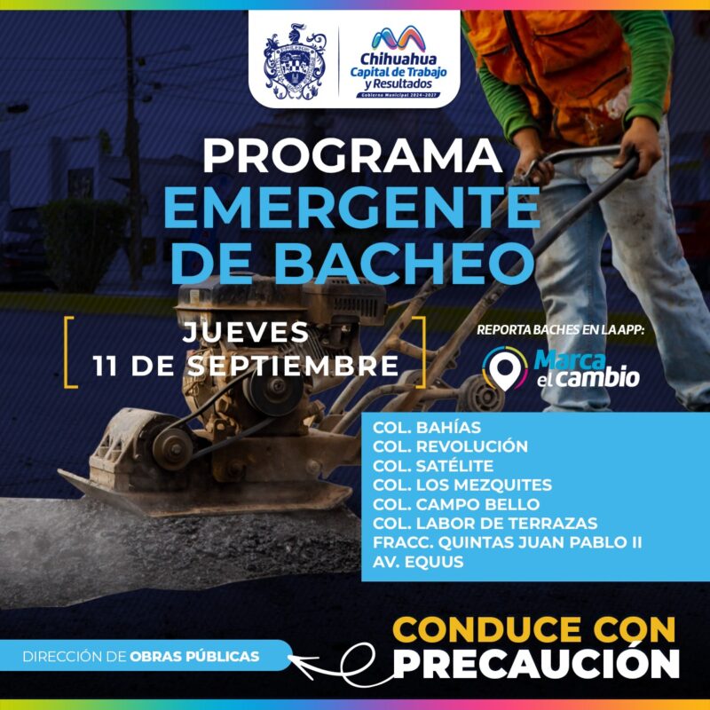 H. Ciudad de Chihuahua, Chih., a 11 de septiembre del 2025.- El Gobierno Municipal, a través de la Dirección de Obras Públicas, trabajará con bacheo este 11 de septiembre, mediante el programa emergente, en las colonias Bahías, Revolución, Satélite, Los Mezquites, Campo Bello, Labor de Terrazas, así como en el Fraccionamiento Quintas Juan Pablo II y la avenida Equus.