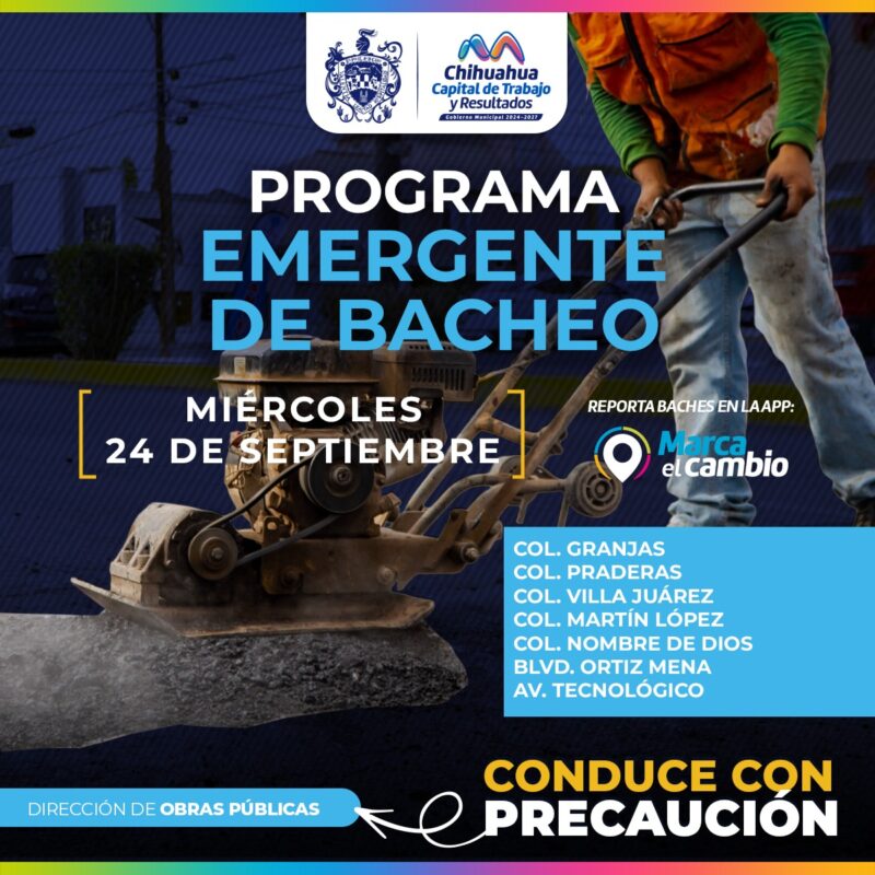 H. Ciudad de Chihuahua, Chih., a 24 de septiembre del 2025.- El Gobierno Municipal, a través de la Dirección de Obras Públicas, trabajará con bacheo este 24 de septiembre, mediante el programa emergente, en las colonias Granjas, Praderas, Villa Juárez, Martín López y Nombre de Dios, así como en el boulevard Ortiz Mena y en la avenida Tecnológico.