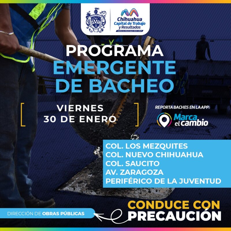 H. Ciudad de Chihuahua, Chih., a 30 de enero del 2026.- El Gobierno Municipal, a través de la Dirección de Obras Públicas, realizará trabajos de bacheo este viernes 30 de enero mediante el programa emergente en calles de las colonias: Los Mezquites, Nuevo Chihuahua y Saucito, así como en la avenida Zaragoza y en el periférico de la Juventud.