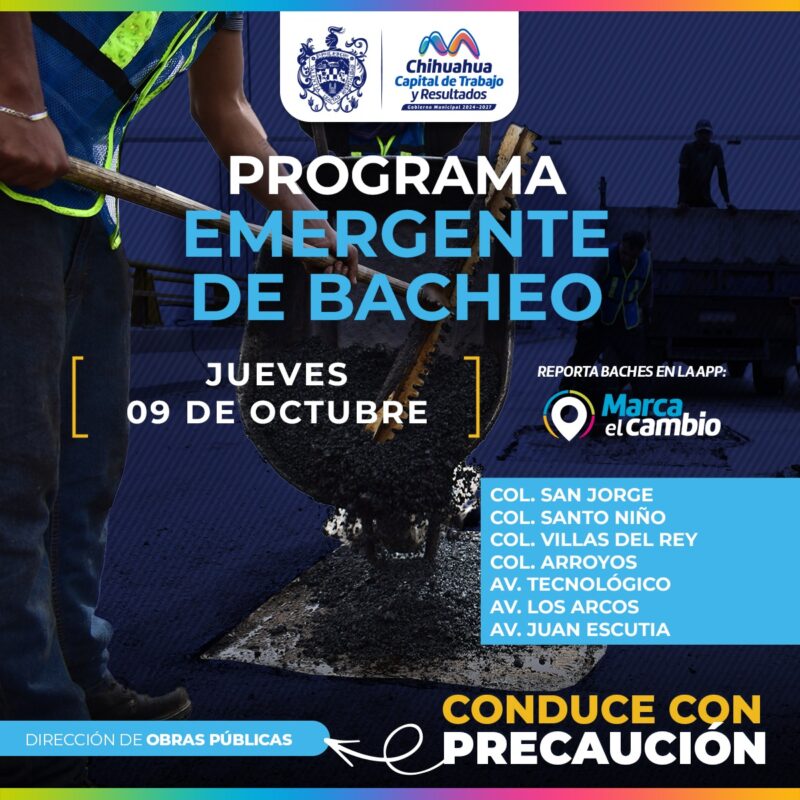 H. Ciudad de Chihuahua, Chih., a 9 de octubre del 2025.- El Gobierno Municipal, a través de la Dirección de Obras Públicas, llevará a cabo trabajos de bacheo este 9 de octubre, mediante el programa emergente, en calles de las colonias: San Jorge, Santo Niño, Arroyos, Villas del Rey, así como en las avenidas Tecnológico, Los Arcos y Juan Escutia.