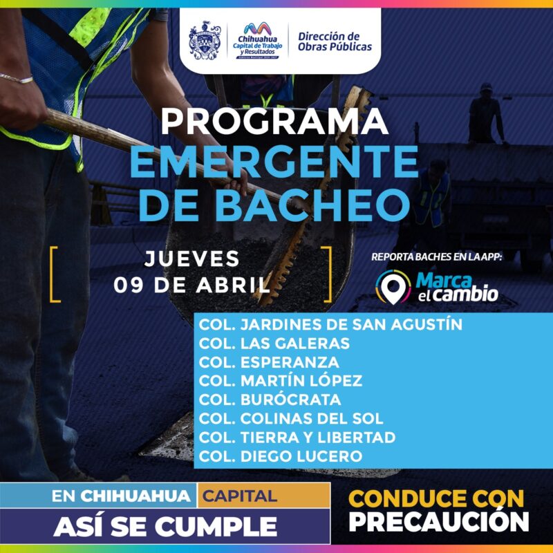 H. Ciudad de Chihuahua, Chih., a 9 de abril de 2026.- El Gobierno Municipal, a través de la Dirección de Obras Públicas, realizará trabajos de bacheo este jueves 9 de abril mediante el programa emergente en las calles de las colonias: Jardines de San Agustín, Las Galeras, Esperanza, Burócrata, Colinas del Sol, Tierra y Libertad y Diego Lucero.