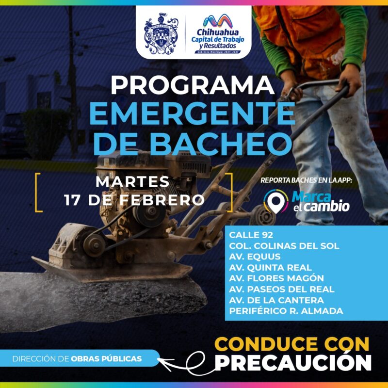 H. Ciudad de Chihuahua, Chih., a 17 de febrero de 2026.- El Gobierno Municipal, a través de la Dirección de Obras Públicas, realizará trabajos de bacheo este martes 17 de febrero mediante el programa emergente en la calle 92, colonia Colinas del Sol, así como las avenidas: Equus, Quinta Real, Flores Magón, Paseos del Real y De la Cantera además del periférico R. Almada
