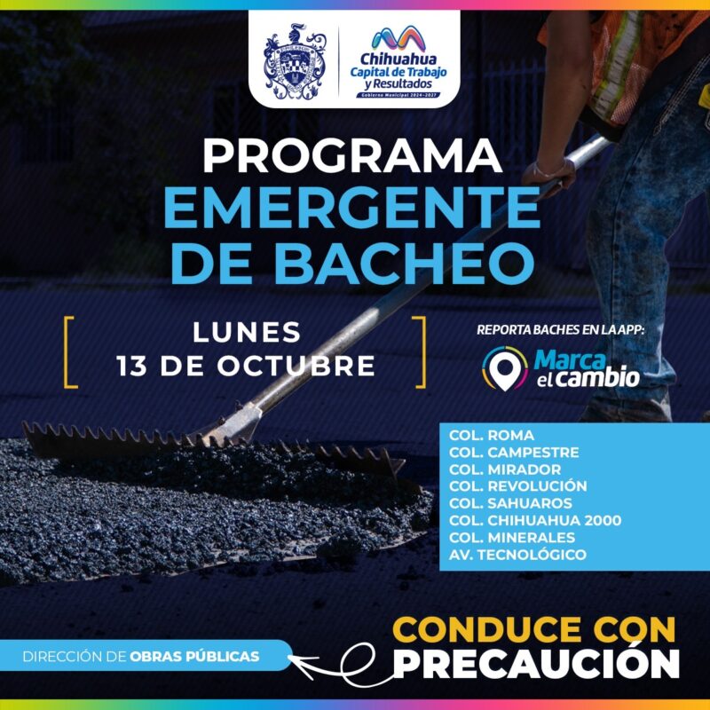 H. Ciudad de Chihuahua, Chih., a 13 de octubre del 2025.- El Gobierno Municipal, a través de la Dirección de Obras Públicas, realizará bacheo este 13 de octubre, mediante el programa emergente, en calles de las colonias: Roma, Campestre, Mirador, Revolución, Sahuaros, Chihuahua 2000, Minerales y avenida Tecnológico.