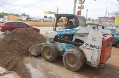 También se llevó a cabo la colocación de material de bloqueo para el cierre de carriles en la Prolongación Homero y Avenida Bahía de San Quintín, por afectaciones en la carpeta de rodamiento y mediante el uso de un camión de volteo y un minicargador se realizó el relleno de un socavón en las calles 46 ½ y Vicente Suarez de la colonia U.P.
