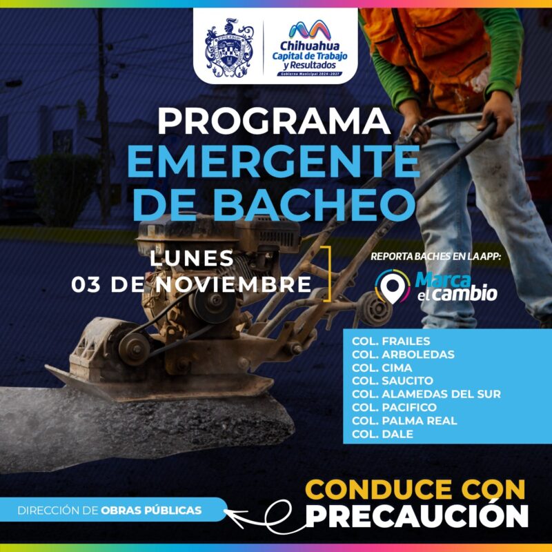 H. Ciudad de Chihuahua, Chih., a 3 de noviembre del 2025.- El Gobierno Municipal, a través de la Dirección de Obras Públicas, bacheará este 3 de noviembre, mediante el programa emergente, en calles de las colonias Cima, Los Frailes, Saucito, Arboledas, Alamedas del Sur, Pacifico, Palma Real y Dale.