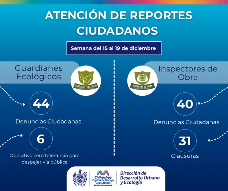 H. Ciudad de Chihuahua, Chih., a 23 de diciembre de 2025.- El Gobierno Municipal de Chihuahua, a través de la Dirección de Desarrollo Urbano y Ecología, informa que del día 15 al 19 de diciembre del 2025, como parte de los trabajos de vigilancia, el personal de Guardianes Ecológicos e Inspectores de Obra realizó 209 inspecciones y reportes.