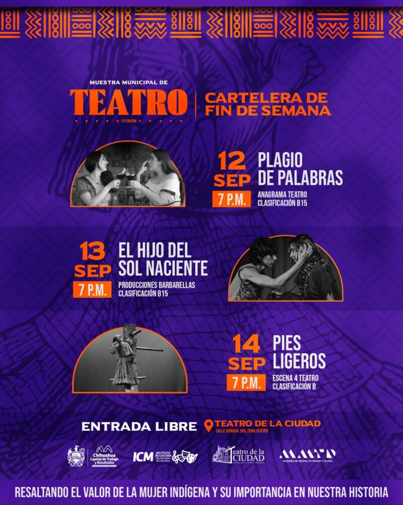 H. Ciudad de Chihuahua, Chih. A 12 de septiembre de 2025.– El Gobierno Municipal de Chihuahua, a través del Instituto de Cultura, invita a disfrutar de las últimas funciones de la 13ª edición de la Muestra Municipal de Teatro, que se presentarán del viernes 12 al domingo 14 de septiembre en el Teatro de la Ciudad, con entrada completamente libre.