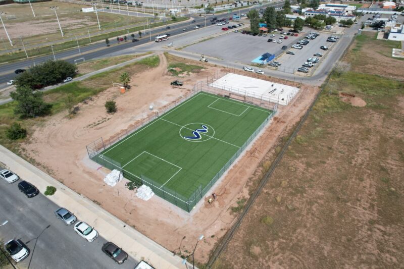 Este espacio destinado a la práctica deportiva contará con dos canchas: una de futbol 7×7, que ya dispone de pasto sintético, porterías y malla ciclónica. Actualmente se realizan trabajos de instalaciones eléctricas; así como una cancha de usos múltiples, la cual ya tiene firmes de concreto y se encuentra en proceso la colocación de la malla perimetral.