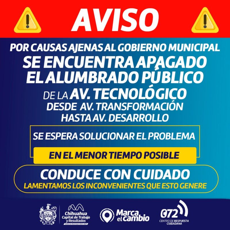 H. Ciudad de Chihuahua, Chihuahua., a 14 de noviembre de 2025.- Debido a actos de vandalismo en el tramo comprendido entre las avenidas Desarrollo y Transformación, en la avenida Tecnológico, las luminarias se encuentran apagadas, por lo que la Dirección de Mantenimiento Urbano informa que se trabaja en la reparación del desperfecto en esta zona y agradece la comprensión de quienes circulan por la zona.