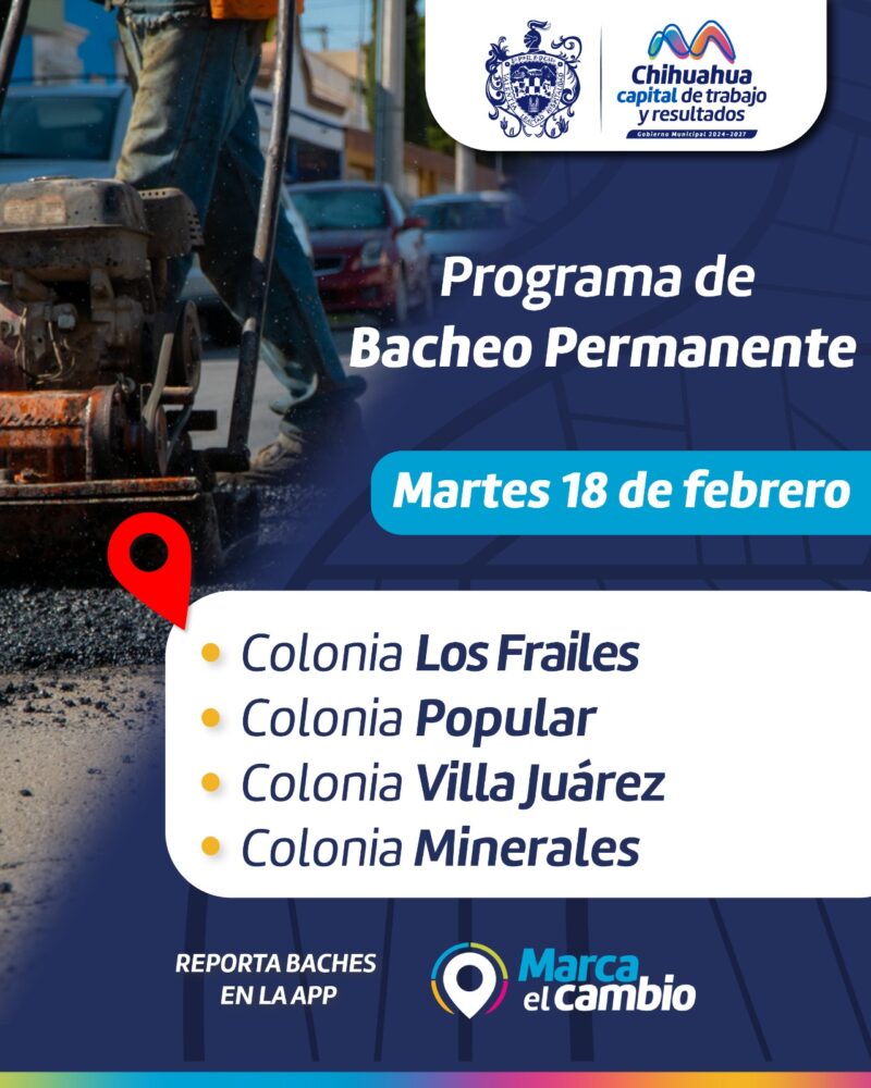 Chihuahua, Chih., a 18 de febrero del 2025.- El Gobierno Municipal, a través de la Dirección de Obras Públicas, anuncia que, para hoy 18 de febrero, las cuadrillas de bacheo trabajarán en calles de las colonias Los Frailes, Popular, Villa Juárez y Minerales.