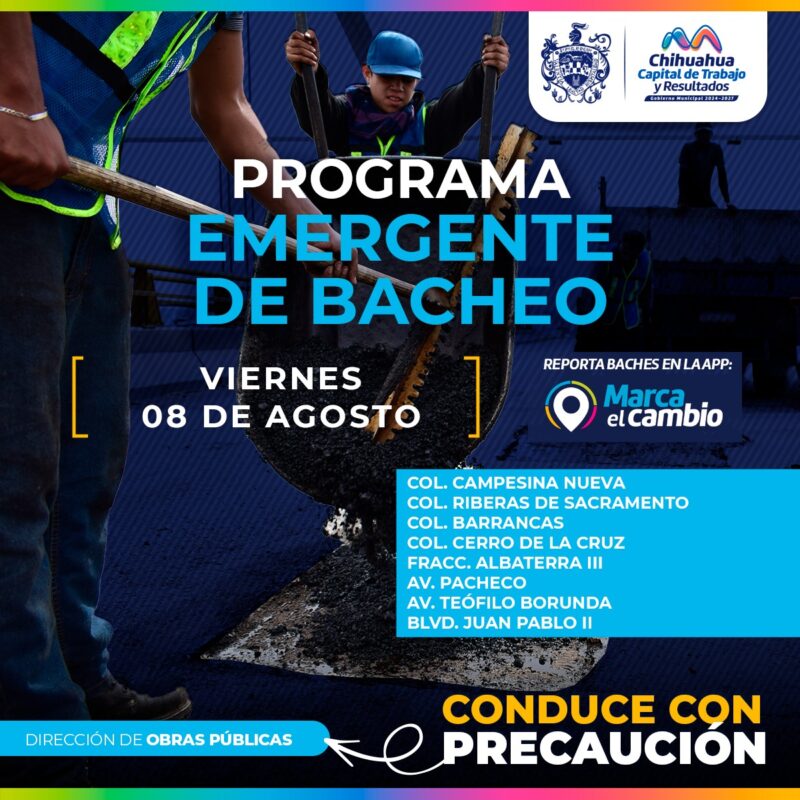 H. Ciudad de Chihuahua, Chih. A 8 de agosto del 2025.- El Gobierno Municipal, a través de la Dirección de Obras Públicas, realizará trabajos de bacheo mediante el programa emergente en las colonias: Campesina Nueva, Cerro de la Cruz, Barrancas y Riberas de Sacramento, así como en el Fraccionamiento Albaterra III y en las avenidas Pacheco, Teófilo Borunda y el boulevard Juan Pablo II.