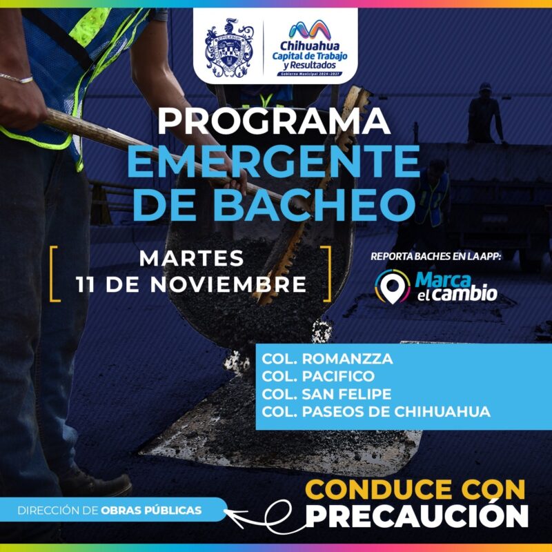 H. Ciudad de Chihuahua, Chih., a 11 de noviembre del 2025.- El Gobierno Municipal, a través de la Dirección de Obras Públicas, realizará trabajos de bacheo este 11 de noviembre, mediante el programa emergente en calles de las colonias: Romanzza, Pacifico, San Felipe y Paseos de Chihuahua.