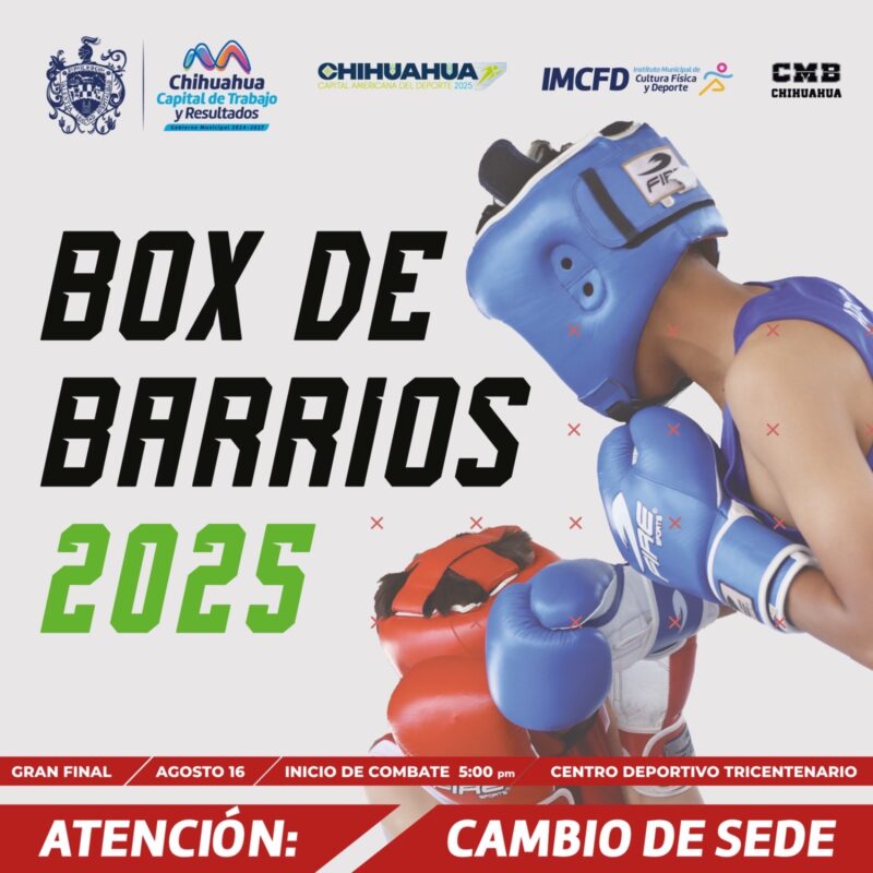 H. Ciudad de Chihuahua, Chih., a 14 de agosto de 2025.- El Gobierno Municipal de Chihuahua, a través del Instituto Municipal de Cultura Física y Deporte (IMCFD), informa que la gran final del Torneo Box de Barrios se llevará a cabo este sábado 16 de agosto en el gimnasio del Centro Deportivo Tricentenario.
