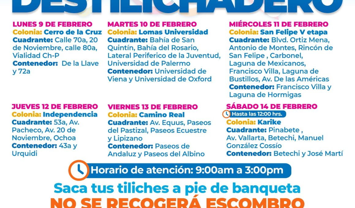 Estará programa Destilichadero en 6 colonias del 9 al 14 de febrero