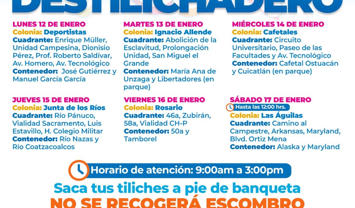 Estará Destilichadero en 6 colonias del 12 al 17 de enero
