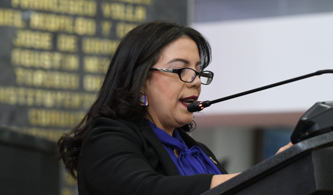 En tribuna, durante la sesión solemne del Premio a la Chihuahuense Destacada, la diputada del Partido del Trabajo,…