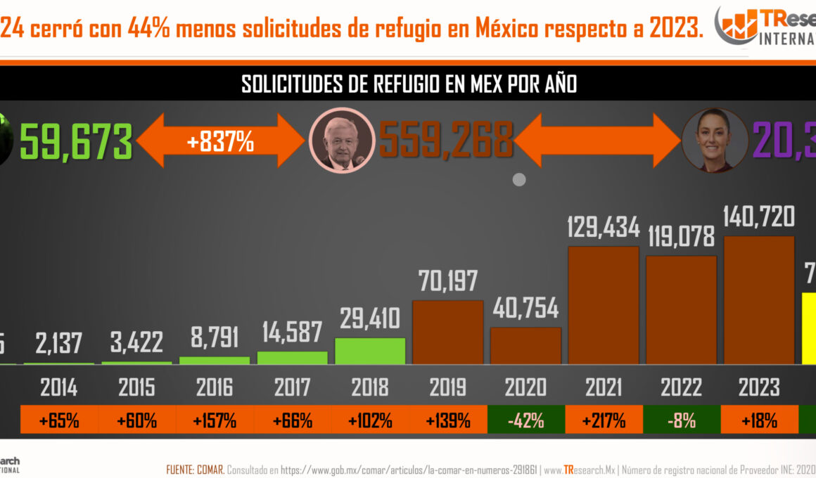 México registró en 2024 un total de 78,975 solicitudes de refugio, lo que representa una caída del 44% respecto a 2023,…