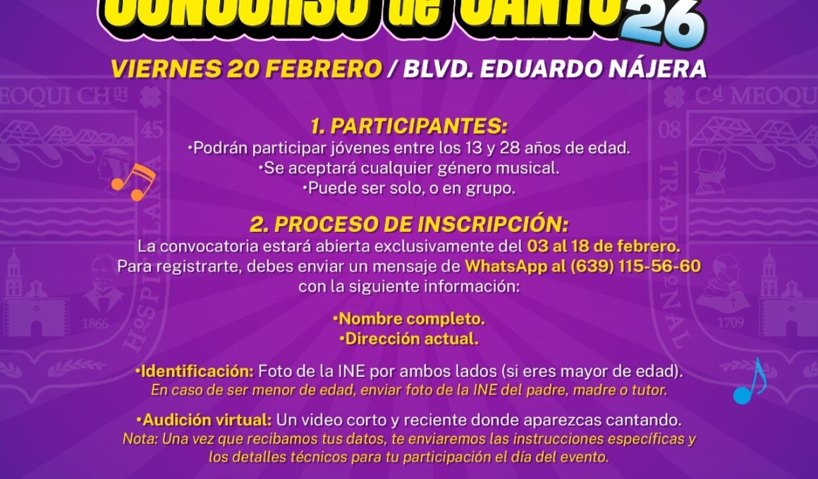 Invita Gobierno Municipal de Meoqui a jóvenes de 13 a 28 años a participar en concurso de Canto