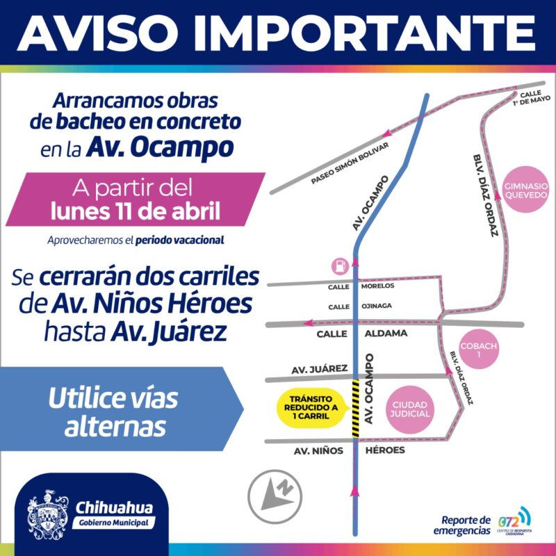 El Gobierno Municipal informa a la ciudadanía que a partir de este lunes 11 de abril se cerrarán dos carriles al tránsito vehicular en la avenida Ocampo, debido a los trabajos de bacheo en concreto hidráulico que se realizarán en el carril izquierdo, desde la avenida Niños Héroes a avenida Juárez en la zona Centro de la ciudad.
