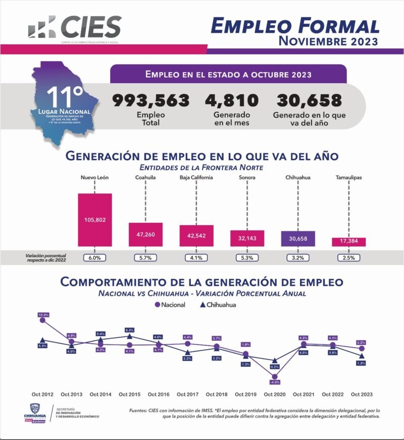 Las cifras reveladas por el Instituto Mexicano del Seguro Social (IMSS) para el estado de Chihuahua reflejan un incremento del 1.3% en los puestos de trabajo, con un registro de 993,563 empleos al cierre de octubre de 2023. Además, se generaron 4,810 nuevos puestos en el mismo mes, sumando un total de 30,658 empleos en lo que va del año.